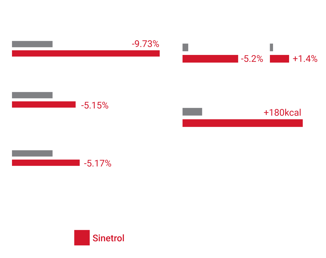 * A reported average 63% of reduction of total body fat in all test subjects after the study ended in 120 days further proclaimsthe Sinetrol® lipolysis effect.
